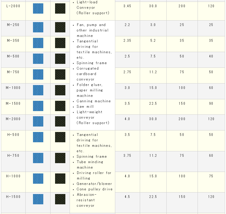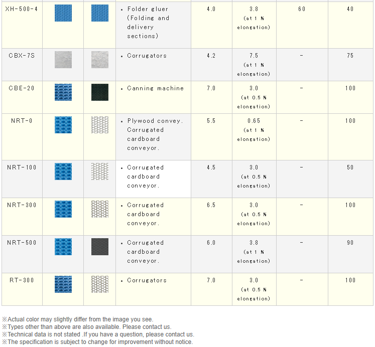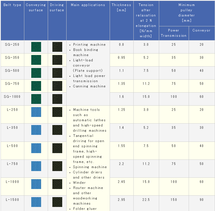 Special abrasion-resistant synthetic rubber (NBR) is used for the belt surface offering stable coefficient of friction and high abrasion resistance.